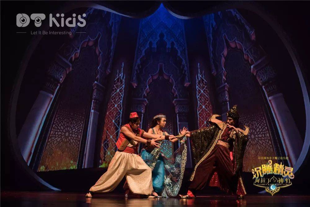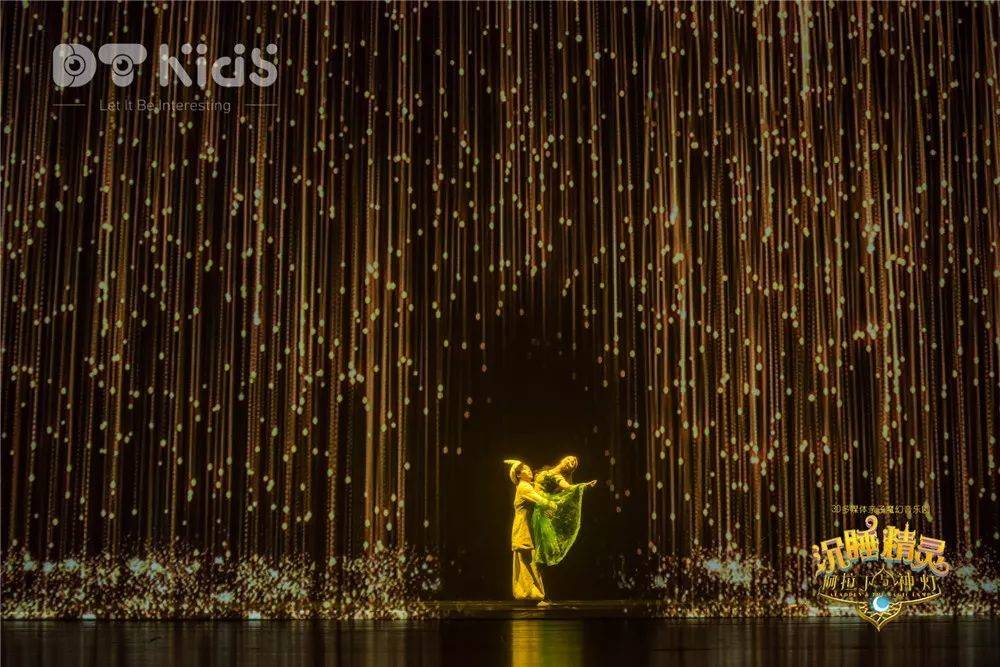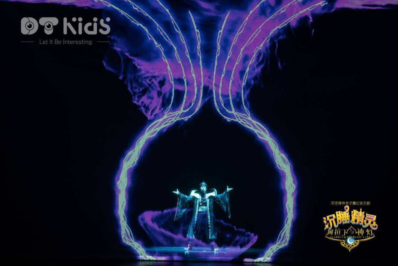 阿拉丁与神灯的故事,它取材自《一千零一夜》中许愿神灯的故事。本剧改编自原著,为了突出展现魔幻、超现实的舞台环境,裸眼3D视觉技术、纱幕投影、三维影像、虚拟动画人物等多媒体视觉表现手段,与演员表演相结合,将舞台打造成一个神奇不伤眼的裸眼3D童话世界,让观众在现实舞台上亲眼看到科技手段构筑的魔幻国度,感受儿童世界的奇思妙想。