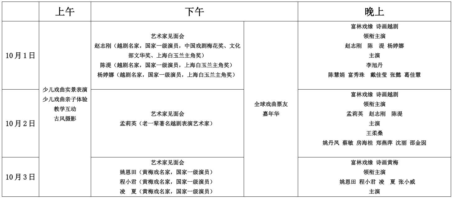 富林戏苑每天演出时间:10月1日-8日10:00-11:00 ;16:00 ;19:15 三个时段(白天每场演出约一个小时,晚上约一个半小时左右,雨天移至室内)