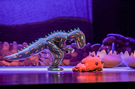 "1……2……3……很好吃!",原来这种大家孩提时代经常玩到的"红灯……绿灯……停!"的游戏,在白垩纪恐龙时代也是相当流行。剧中的主角小甲龙"很好吃"干脆把它变成了自己的专属游戏,在台上和众恐龙把"1……2……3……很好吃!"玩的不亦乐乎。连一向残忍的霸王龙也沉浸在游戏的欢乐中,不知不觉竟然把自己的"食物们"都放走了。"你动了!你输了!"恐龙们憨态可掬的表演,使得现场欢笑不断。