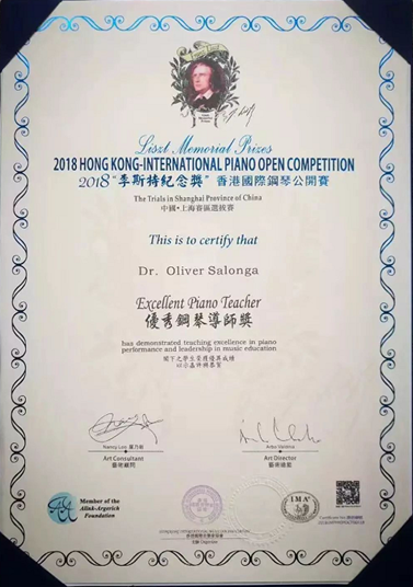 Dr. Oliver Salonga, piano praised for his emotional energy and technical brillance, Oliver Salonga has enthralled music aficionados in the concert halls of the United States, United Kingdom, Germany, Italy, Japan, Korea, Singapore, Taiwan, Philippines, Australia, and China. He has had a graceful transition from being a child prodigy to an artist of high musical insights.