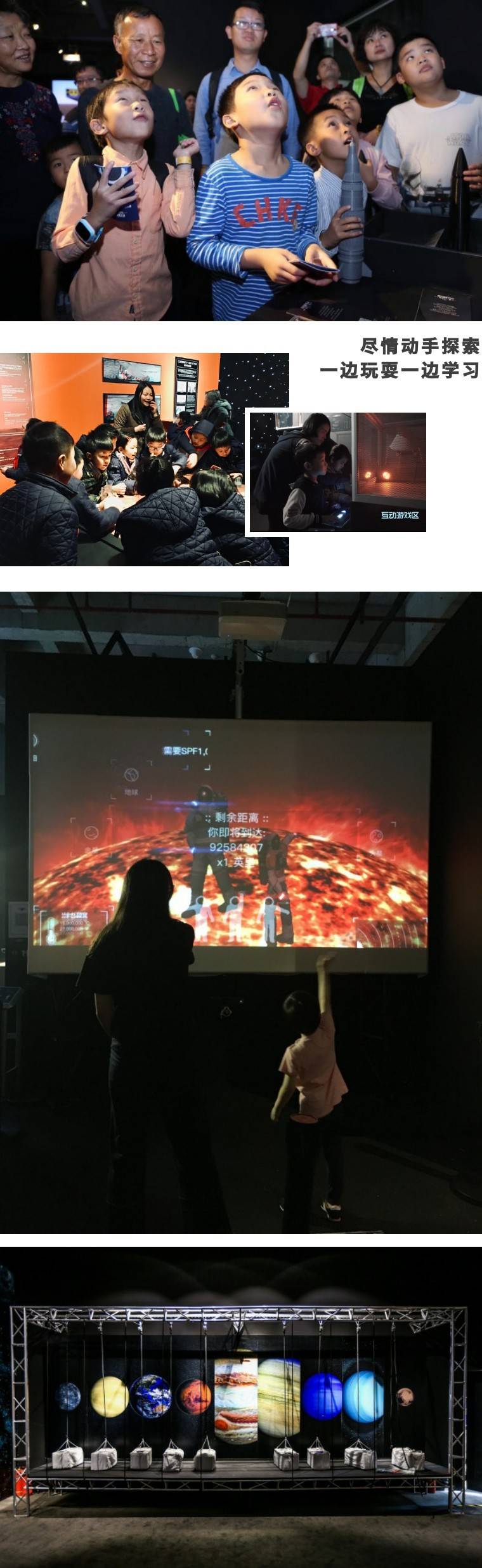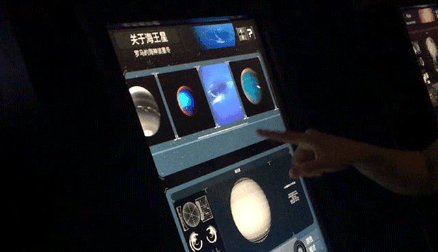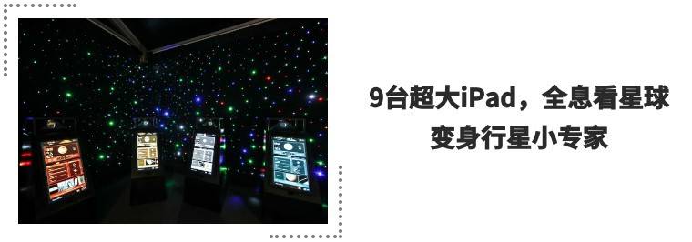 每台iPad代表一颗行星,顶端有腾空漂浮的9颗行星,手指点一点就可以放大,缩小,旋转这颗星球,切换面板,就能看透行星探测器的酷炫结构,手指划一划,就能看到NASA拍下的珍贵图片。