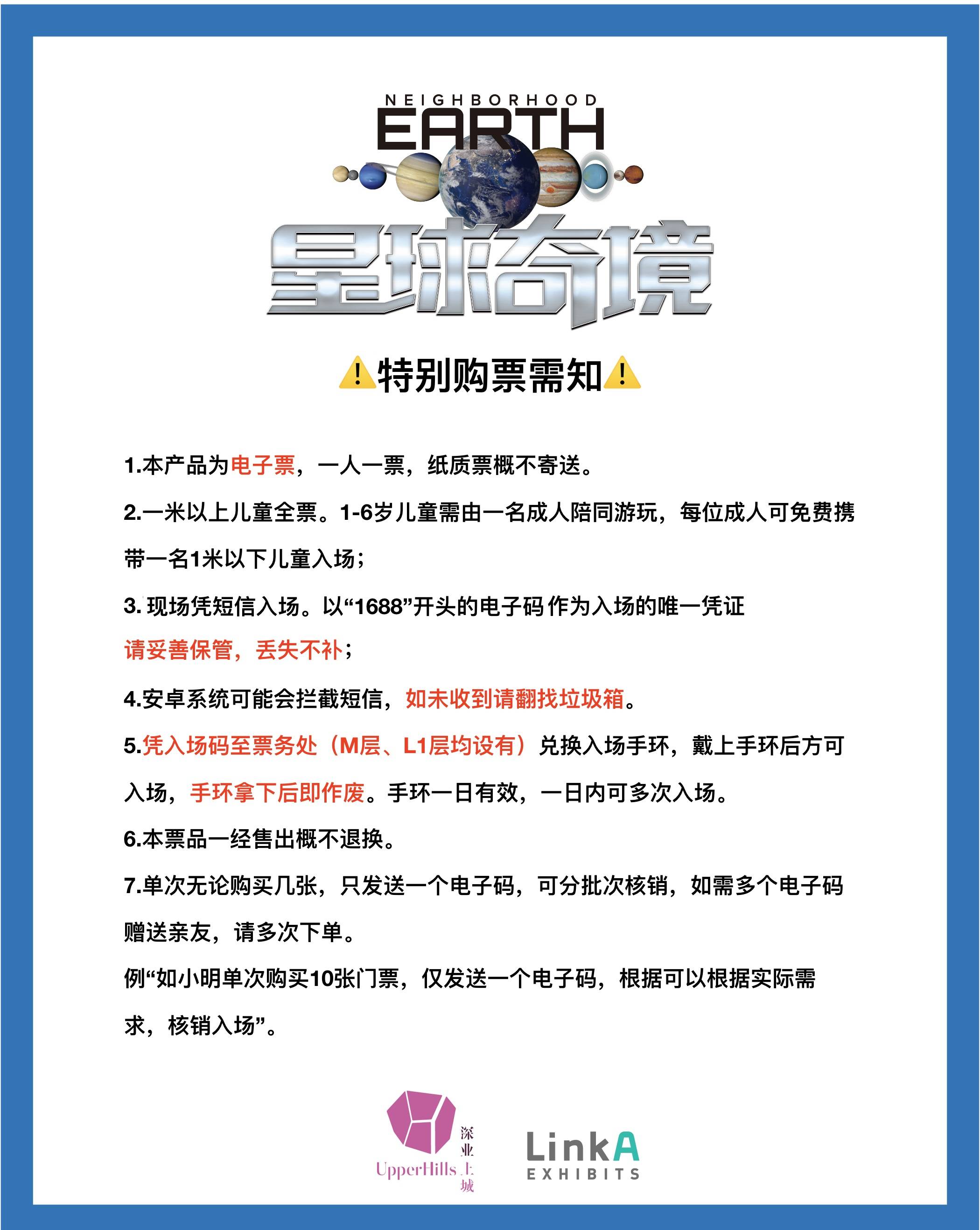 《星球奇境》深圳站共分为六大主题展区:主展区、星球影院、太空训练场、地球游乐场、创意手工坊及教育课堂区。展区分散在深业上城各楼层,凭入场手环一日内可多次出入各展区,真正的不限时随便玩,绝对是暑假出行的首选!
